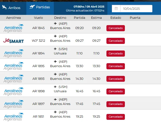 En El Calafate había programados para mañana miércoles siete vuelos de Aerolíneas Argentinas y uno de JetSmart, que también anunció que cancelerá todos los vuelos domésticos para ese día.