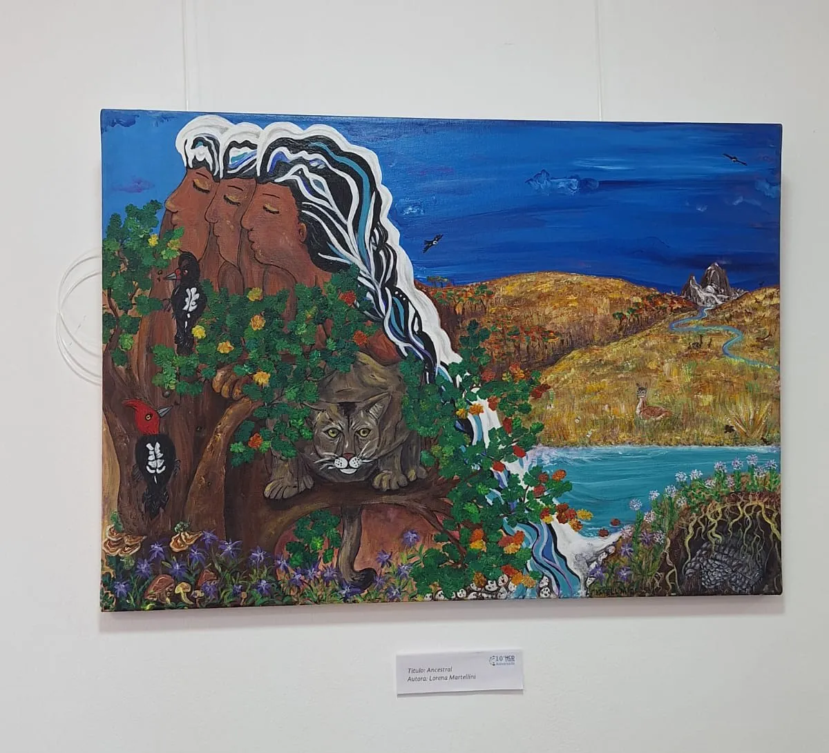 La misma autora recoge el verbo que titula la muestra de ocho obras realizadas en la técnica acrílico sobre tela "Fluir como el río, fluir en territorio, fluir en el arte como un juego de infancia". Lorena nos comparte en Ahora Calafate que también parte de la inspiración de sus obras es una poesía de Juan L. Ortiz, que procedió a leerla en la inauguración.